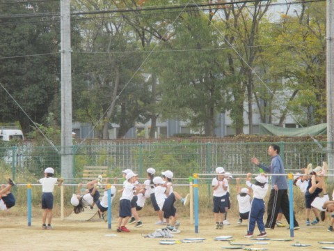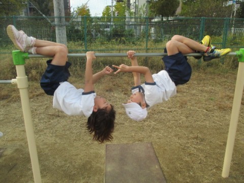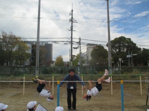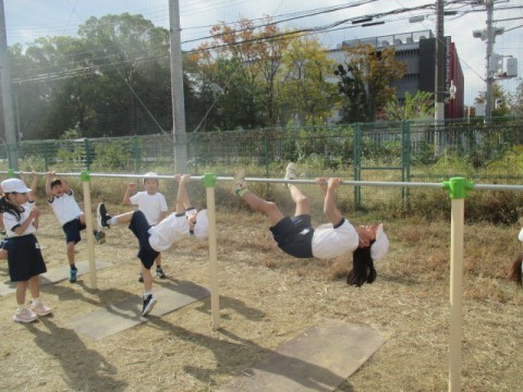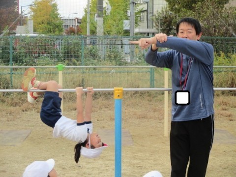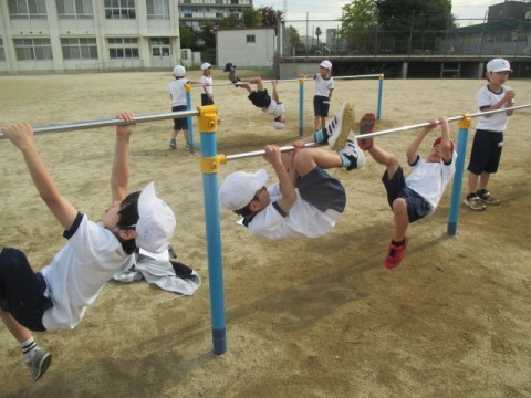 縄跳びをしたあと,鉄棒の技に取り組んでいます。