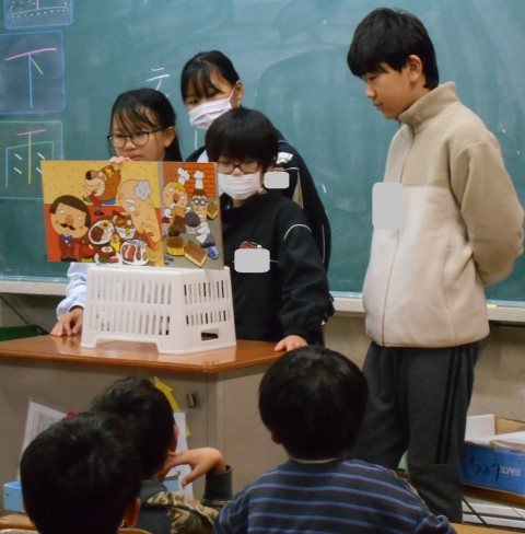 低学年に向けて,給食委員会が食育に関する内容の『紙芝居』を上演しました。