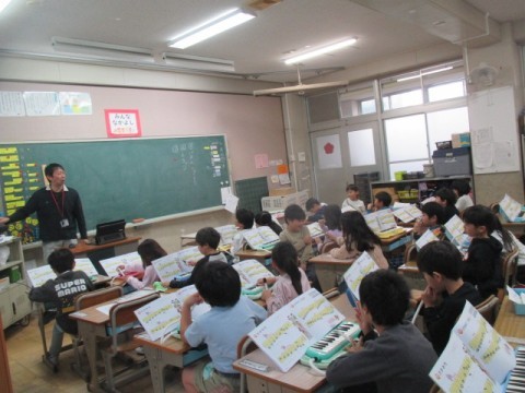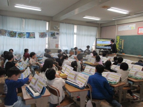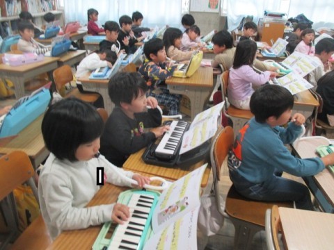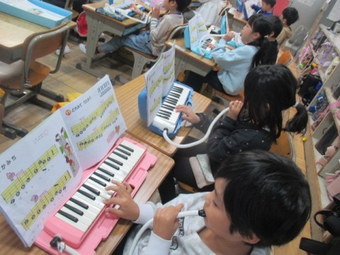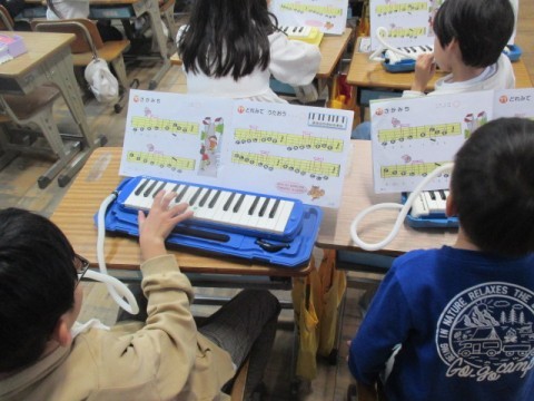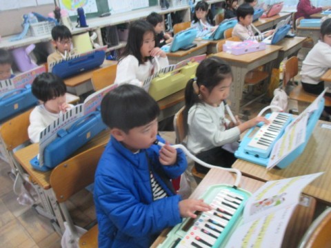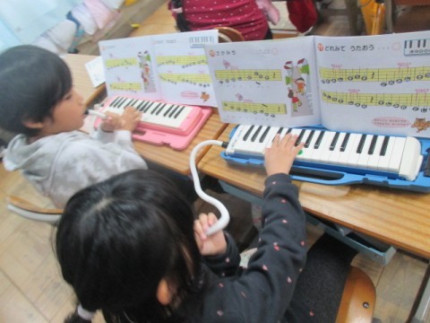 ♪「さかみち」「どれみでうたおう」の曲をけん盤ハーモニカでゆび使いに気をつけながら演奏をしています。