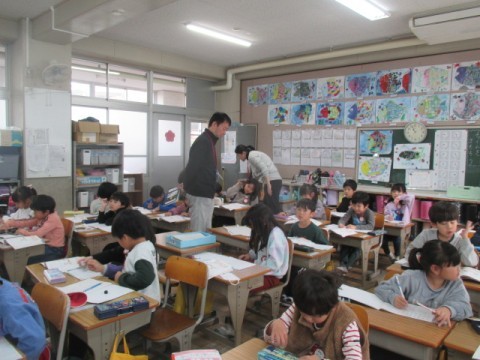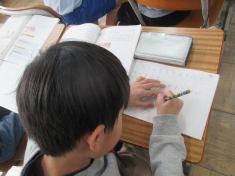 1組の算数「ひき算」です。「おかしが12こあります。3こたべると残りはなんこですか」の問題を考えています。