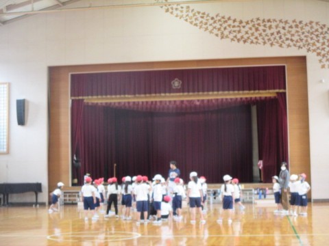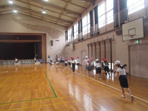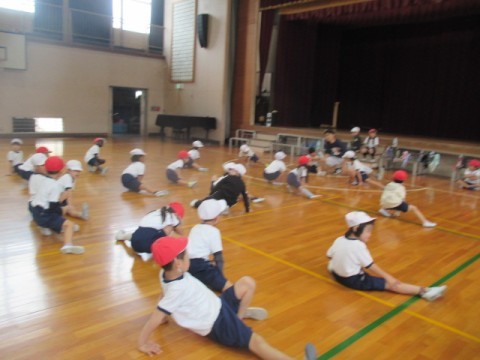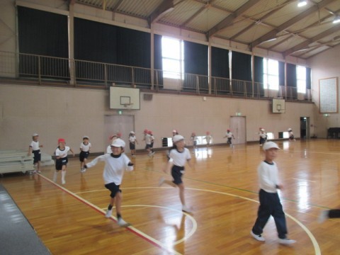 最初に5分間走をしています。そのあと,準備体操をがんばっていました。