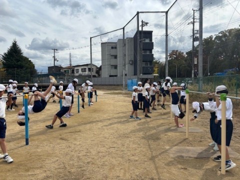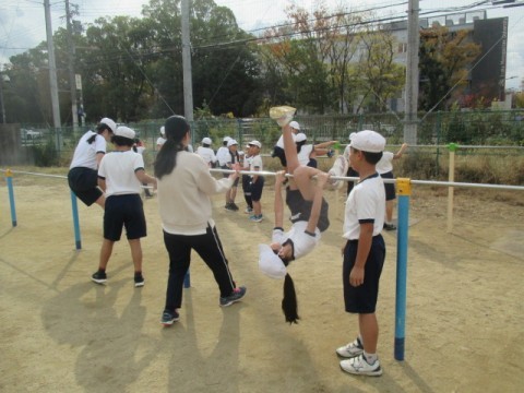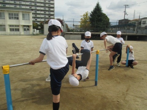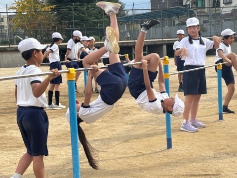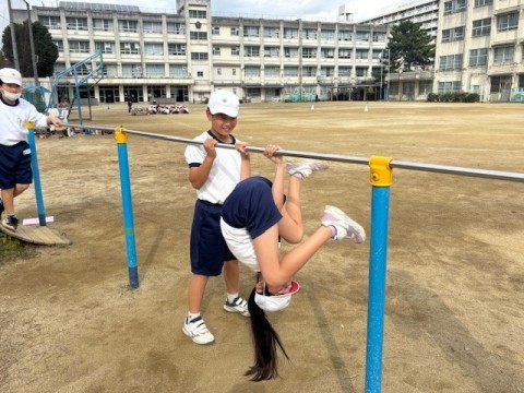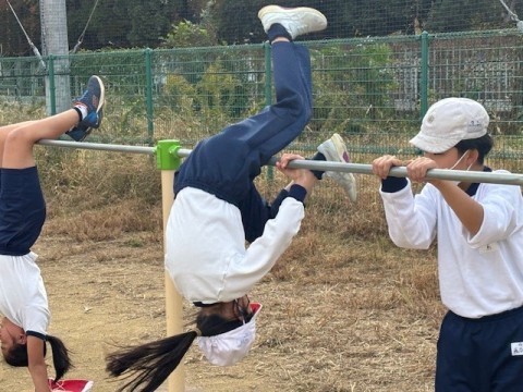 鉄棒の技に取り組んでいます。「あしかけまわり」に挑戦です。