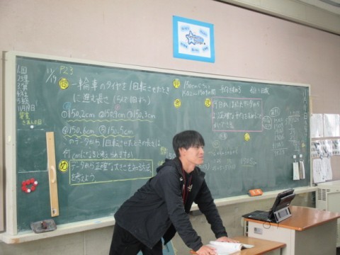 一輪車のタイヤの1回転したときの進む距離を5人が測ります。そ今日のめあては,そののデータから正確な大きさを知る方法を知ろう」です。
