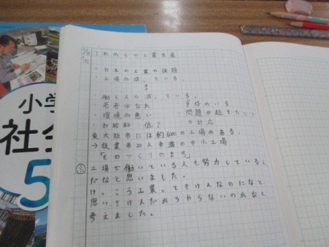 社会では「工業の課題」について意見を出し合っていました。