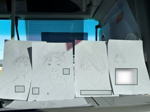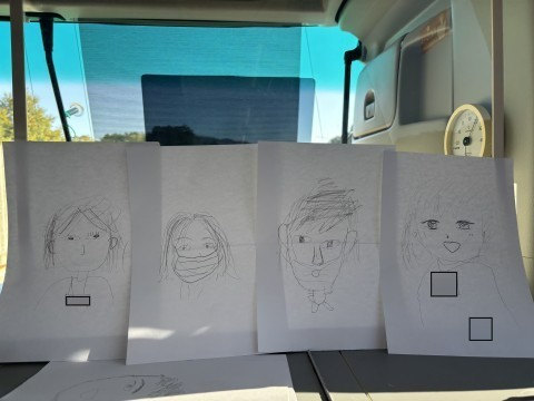 バスの座席の縦の列で競います。1人10秒の持ちタイムで、目→鼻→というように描き、前の座席へおくります。到着した4枚から、一枚を選びます。