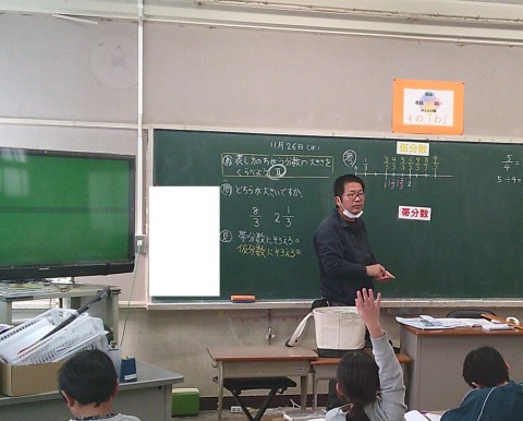 3組の算数では,表し方の違う分数の大きさくらべの学習に取り組んでいました。