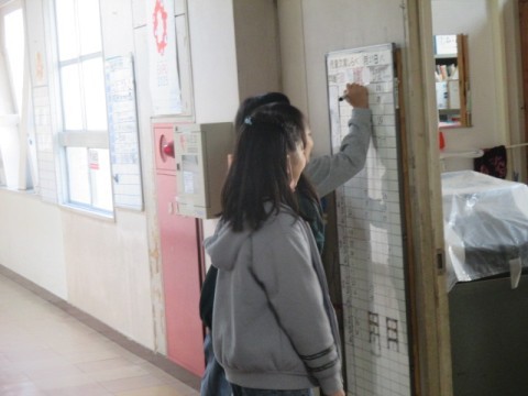 健康観察をして職員室前ホワイトボードに記入しに来ている子どもたちです。