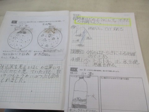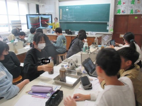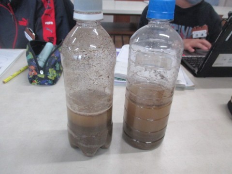 「地層を作るには?」について取り組んでいます。各班でペットボトルに「地層」を作っています。