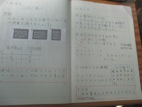 5年 学習のようす 2 公開日 2025/12/01 更新日 2025/12/01 5年生 12月1日(月) 2組の算数「比べ方をかんがえよう」の学習です。めあてアは「面積もうさぎの数も違うときの混みぐあいの比べ方を調べよう」です。今日は,担任の先生がお休みなので,1組の先生が授業を進めています。 +6