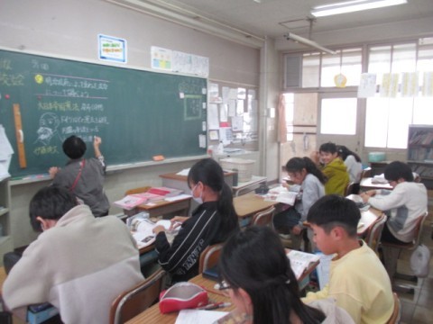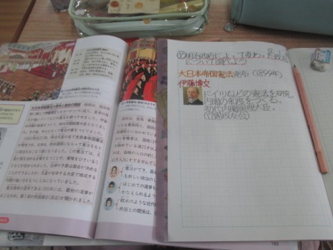 6年 学習のようす 4 公開日 2025/12/01 更新日 2025/12/01 6年生 12月1日(月) 4組の社会「明治政府になって」の学習です。めあては,変わった政治について調べよう」です。大日本帝国憲法や伊藤博文についてまとめています。 +5
