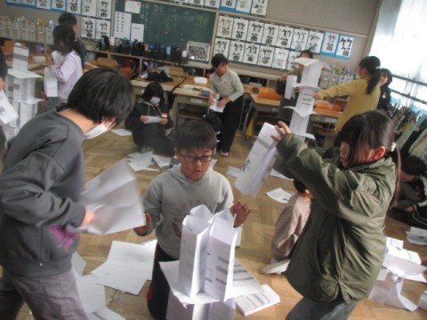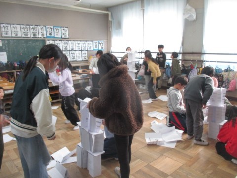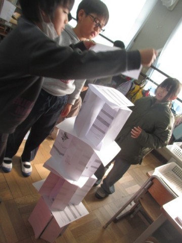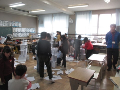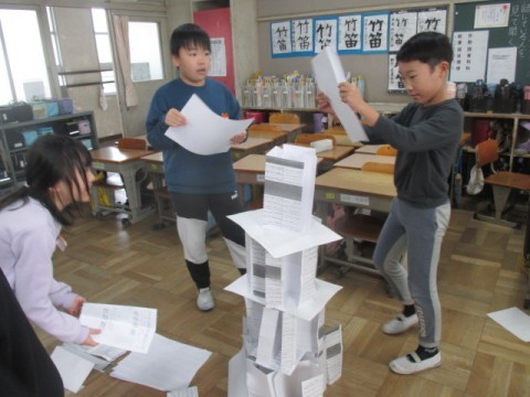 「土日のたのしかったこと」「がんばったこと」をサイコロトークをしていました。そのあと,ペーパータワーを班で協力して作っていました。