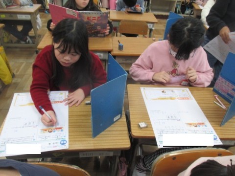 4年 学習のようす 3 公開日 2025/12/08 更新日 2025/12/08 4年生 12月8日(月) 3組の算数です。「分数」のテストをしています。体育は,体育館で5分間走を行っています。 +5