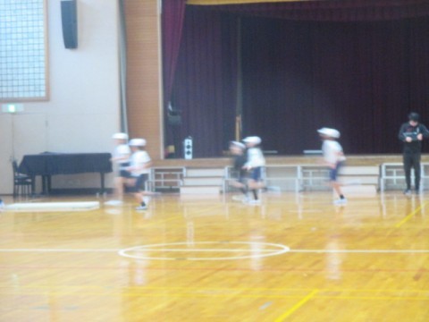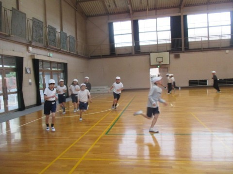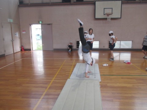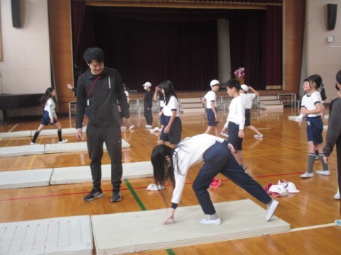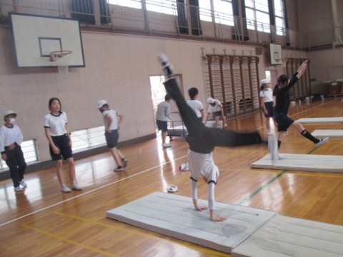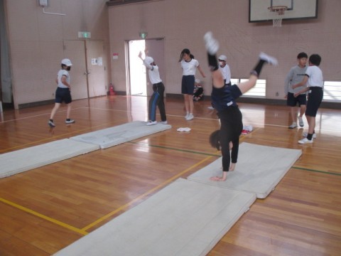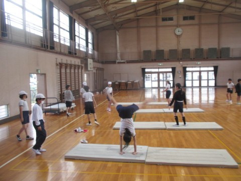 体育館でマット運動「側転」に取り組んでいます。