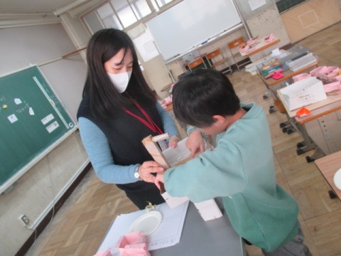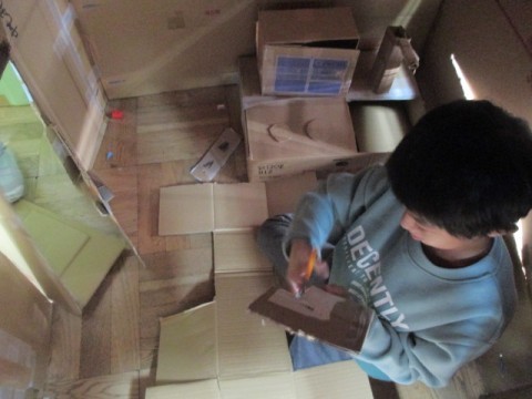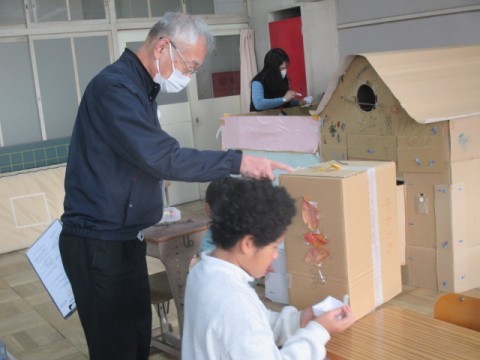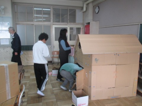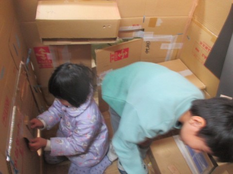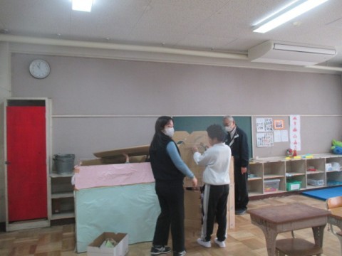 秋見つけ集めたどんぐりや,イチョウの葉,まつぼっくり,木の枝などを使って,作りたいものを決めダンボールハウスに飾りつけをしていました。