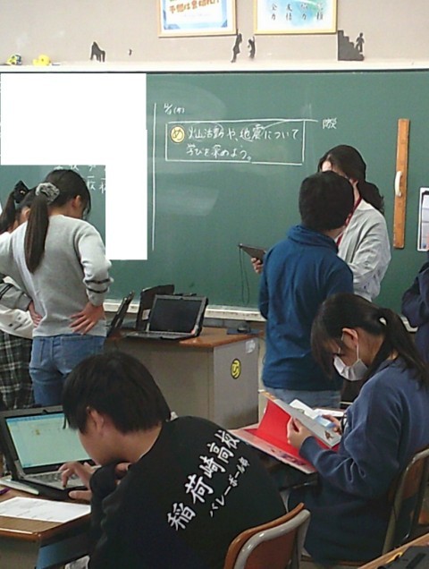 2組の理科では,火山や地震について学習したことをまとめていました。