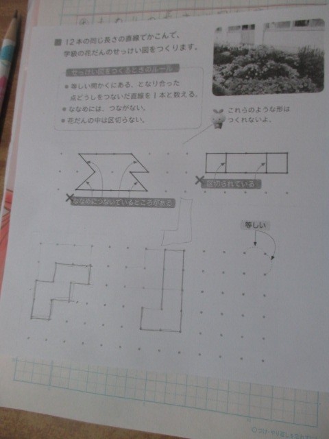 今日のめあては「まわりの長さが同じ花だんの広さを比べよう」です。