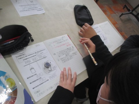 今日のめあては「てこをどのように使えば,重いものを小さな力で持ち上げることができるのだろうか」です。ノートに考えを書いています。
