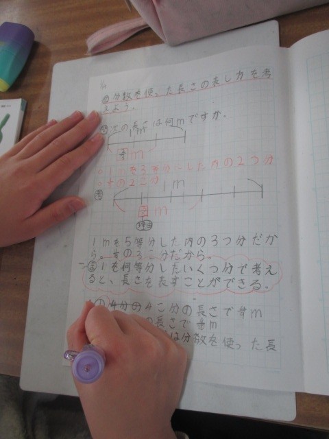 3年 学習のようす 2 公開日 2026/01/14 更新日 2026/01/14 3年生 1月14日(水) 2組の算数です。今日のめあては「分数を使った長さの表し方を考えよう」です。「1を3等分した2つ分の数」を考えていました。 +5