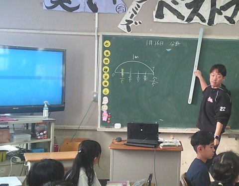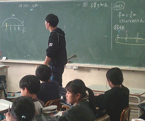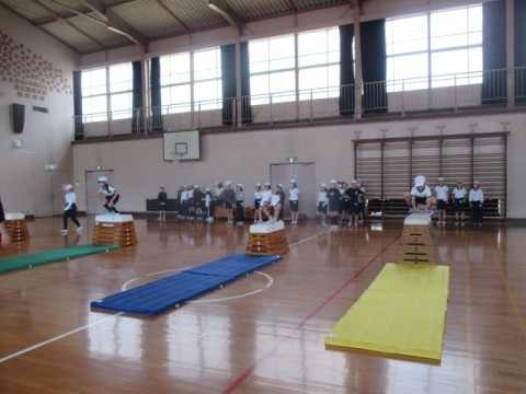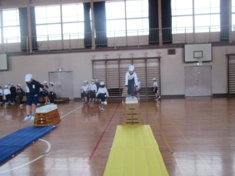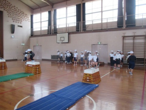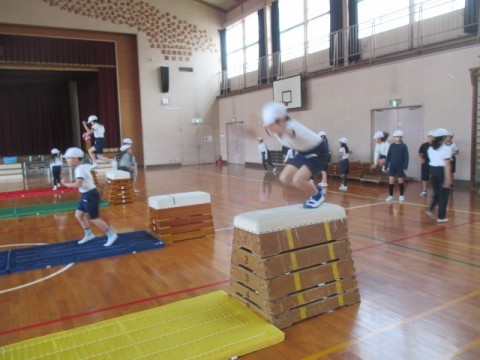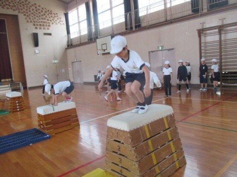 体育は,とび箱に挑戦します。そのために「台に手をついてのる」練習をしていました。