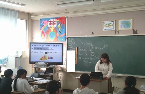 2組の外国語活動では,I want to~という構文の学習に取り組んでいました。