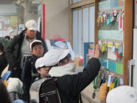 登校後すぐ,8時になり,教室の鍵をとりにきたこどもたちです。「おはようございます」と元気なあいさつをしています。