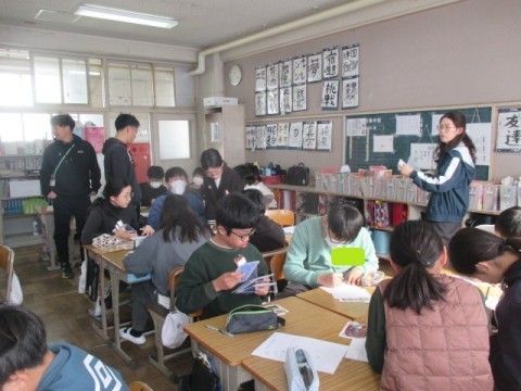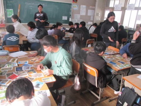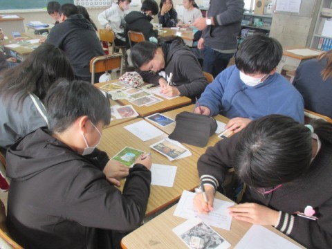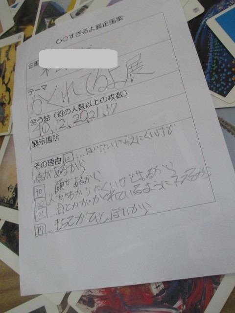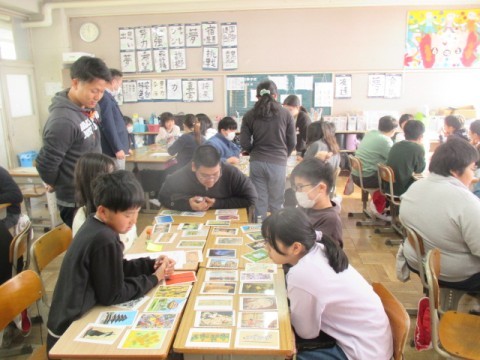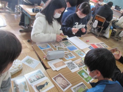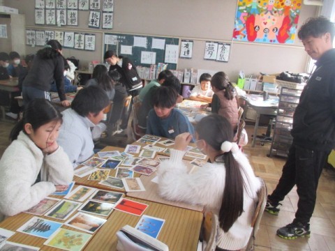 6年 学習のようす 3 (図工 公開授業) 公開日 2026/01/22 更新日 2026/01/22 6年生 1月22日(木)3組の図工「アートカードで『〇〇すぎる展』をひらこう」です。今日のめあては「テーマにあったアートカードを集めて『〇〇すぎるよ展』をひらこう」です。今日は公開授業です。隠れてる展,カラフル展,発送おもしろすぎる展,ふしぎ展,よくわからないカード展,どこをみたらいいかわからなすぎるよ展等,6つの班のテーマが決まった後,それぞれが1枚のカードを選び,紹介カードを書いています。全員の組み合わせて1つの掲示物をつくるようです。 +7