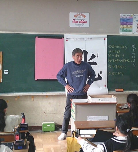 2組の習字では,光という字をとめはねはらいに気をつけて書いていました。
