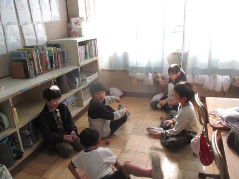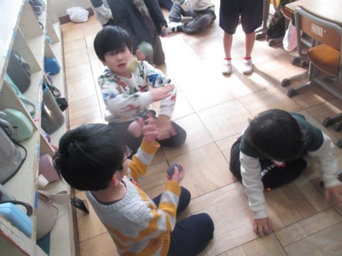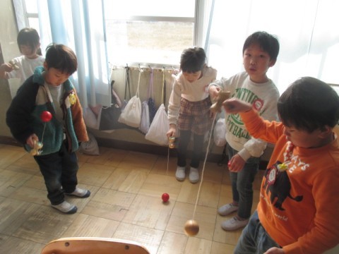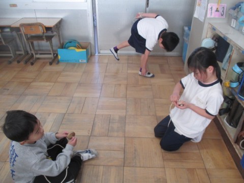 3組の教室では,こま,けん玉,お手玉などの練習をしていました。