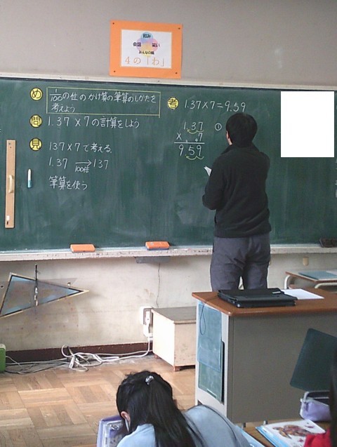 1組の算数では,100分の1の位のかけ算の筆算の学習に取り組んでいました。