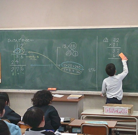 1組の算数では,12×23についての筆算の学習に取り組んでいました。