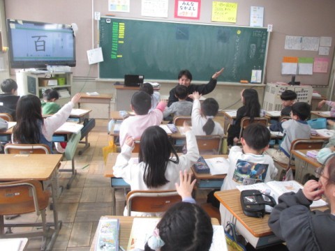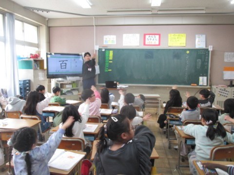 国語は新出漢字の「百」を学習しています。今日のめあては「しせいチャンピオンになろう」です。