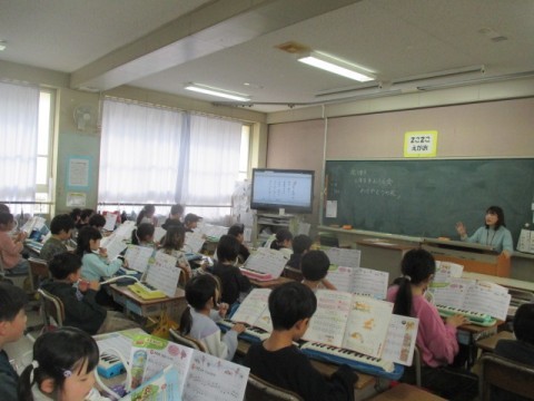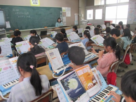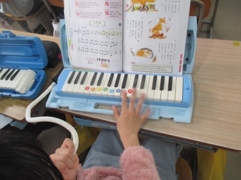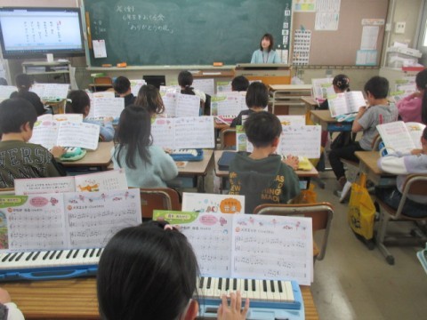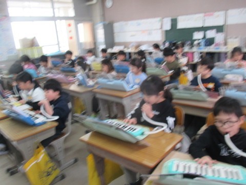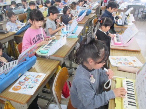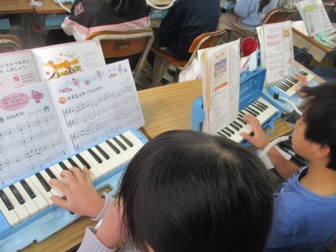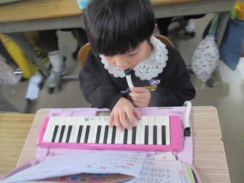 けん盤ハーモニカを使って♪「かねがなる」「メヌエット」等の曲を練習しています。