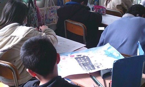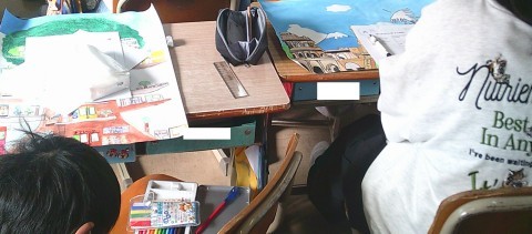 2組の図工では,あったらいい町,どんな町というテーマで描いていました。
