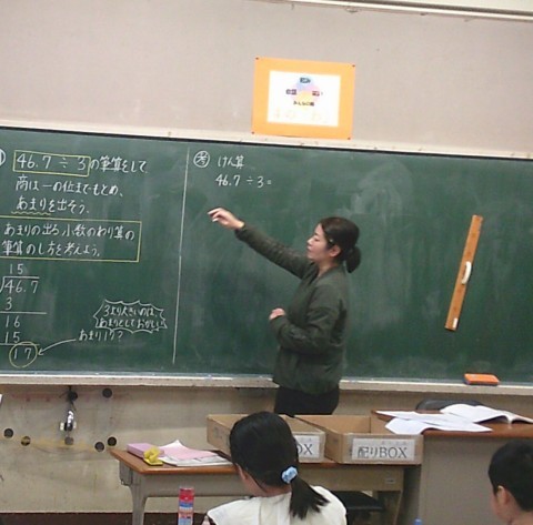 3組の算数では,あまりの出る小数のわり算の筆算の仕方について考えていました。
