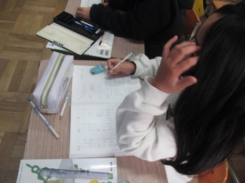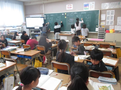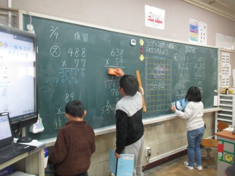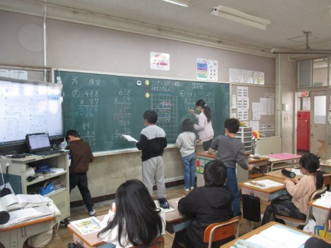 今日は,「3けた×2けたのひっ算の求め方を考えよう」に取り組んでいます。488×77や638×59の計算をしています。