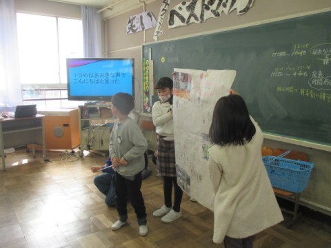 学習参観で発表する「1年間のふりかえり」の練習をしています。