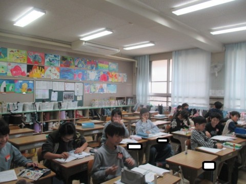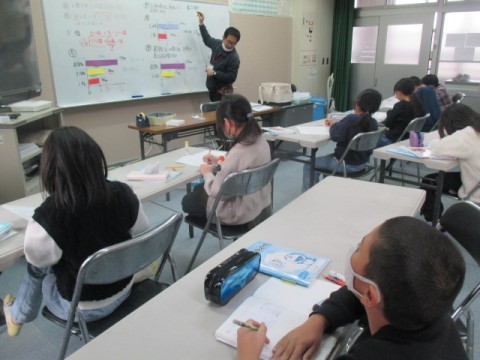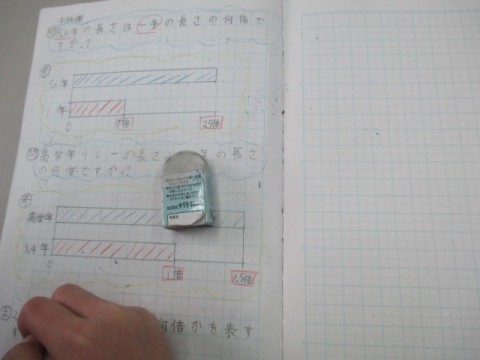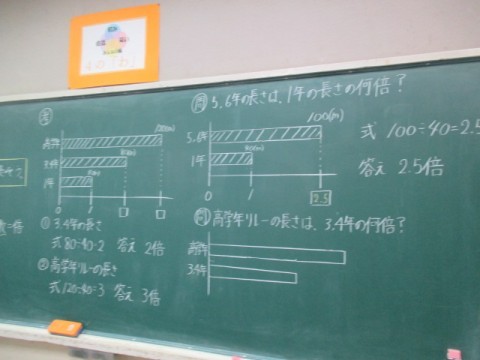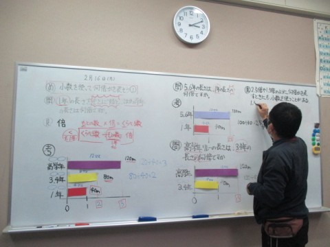 少人数教室と教室のようすです。今日のめあては「小数を使って何倍か考えよう」です。
