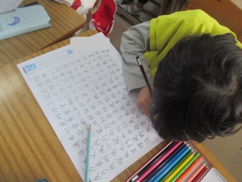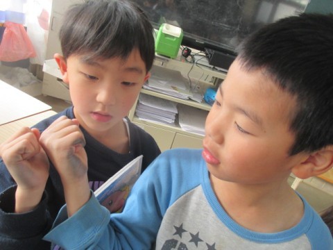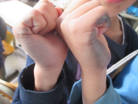 「見てみて~」と一生懸命取り組んだ結果の証,手の平についたえんぴつの後を見せてくれました。