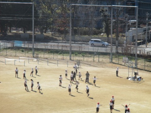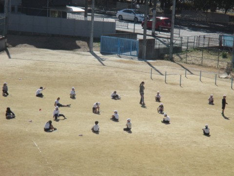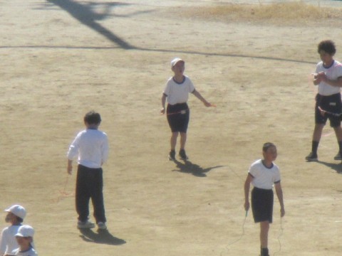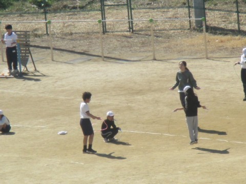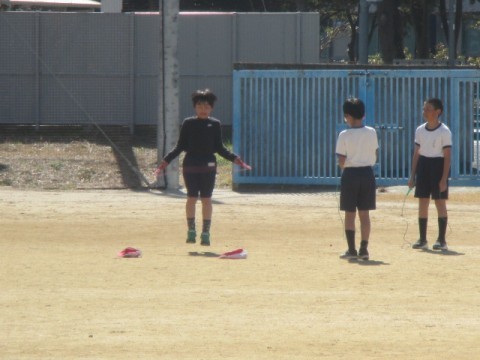 運動場で,5分間走のあと,縄跳びの技に取り組んでいます。