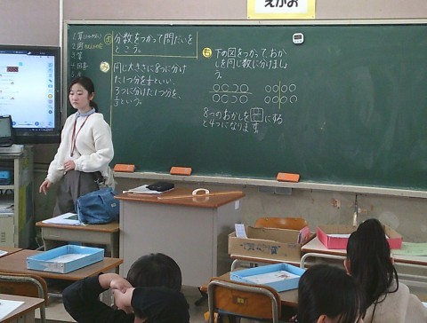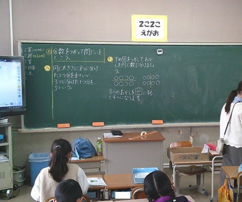 2組の算数では,分数を使った問題の学習に取り組んでいました。