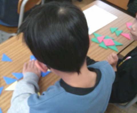 2組の算数では,いろいたを並べていろいろな形を作っていました。