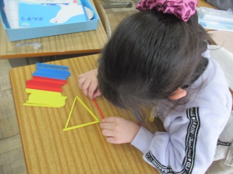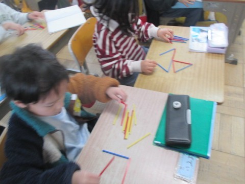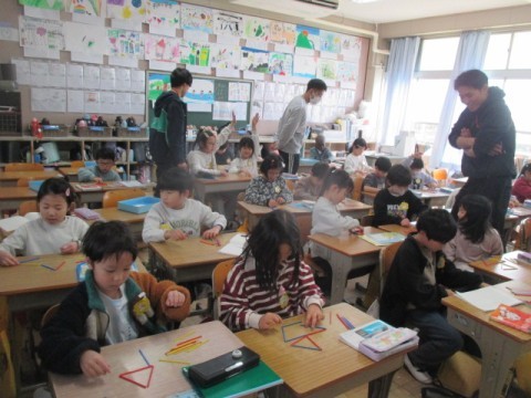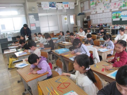 1年 学習の様子2 公開日 2026/03/09 更新日 2026/03/09 1年生 3月9日(月)2組の国語では,まとめのテストに取り組んでいました。算数では,「数え棒でいろいろなかたちをつくろう」に取り組んでいます。体育では,キックサークル的あてゲームをしています。 +7