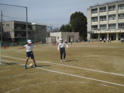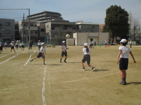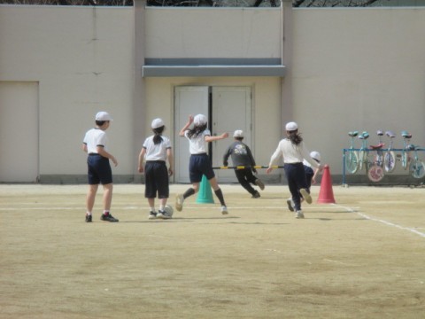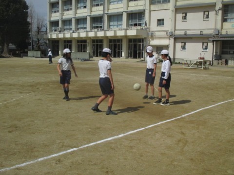 1組の体育です。ラインサッカーに取り組んでいます。