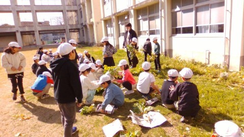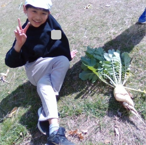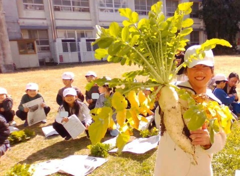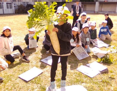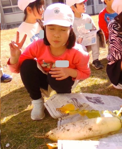 ちょうど「人が足を組んでいる」ように見える「おもしろダイコン」にも,子どもたちの注目が集まりました。