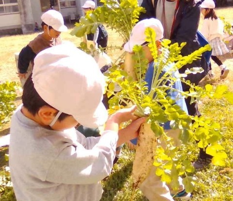 ですが,白いダイコンの姿を見ると,子どもたちから「大きい~。」「重い~!」と歓声があがりました。