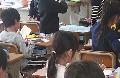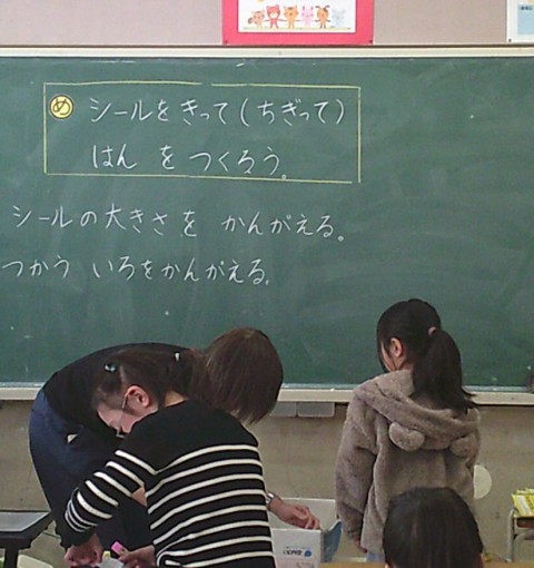 3組の図工では,シールをきって版を作る学習に取り組んでいました。