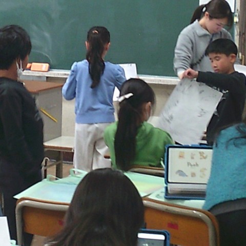 3組では,自分たちで絵をかいた作品袋に作品を入れていました。