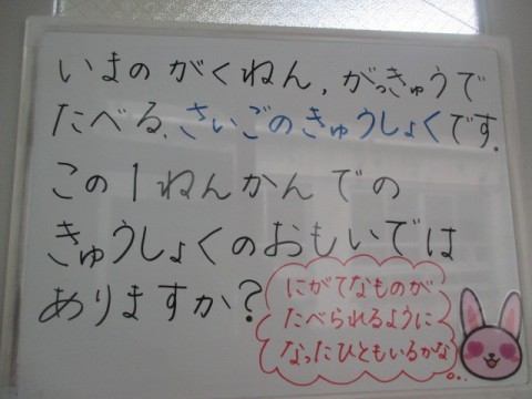 今日までおいしい給食を準備や調理していただきましてありがとうございました。栄養教諭の先生と調理員の方々に感謝です。