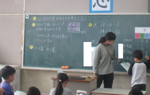 4年生の算数では,かけ算やわり算を使った計算問題を解いていました。