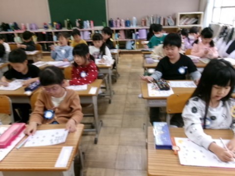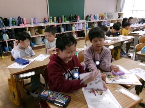 くまさんと一輪車,どちらがおおいかくらべています。どんな方法で,くらべたのかをお友だちと見せ合いをしています。